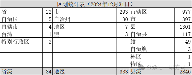 截至2024年底,省级政区数量为34个,地级政区数量为333个,县级政区数量为2846个,与2023年底相比,增加2个县。